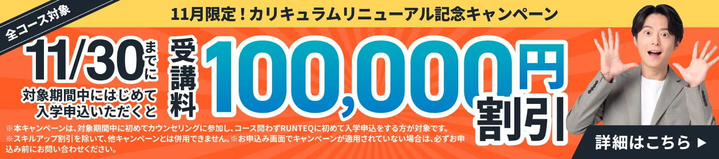 NEWS RUNTEQで受講料の分割決済ができるようになりました 2021年6月25日 渡邊裕太 https://runteq.jp/blog/wp-content/uploads/2022/03/RUNTEQ_BLOG_logo.png 未経験からWebエンジニアへ RUNTEQ BLOG