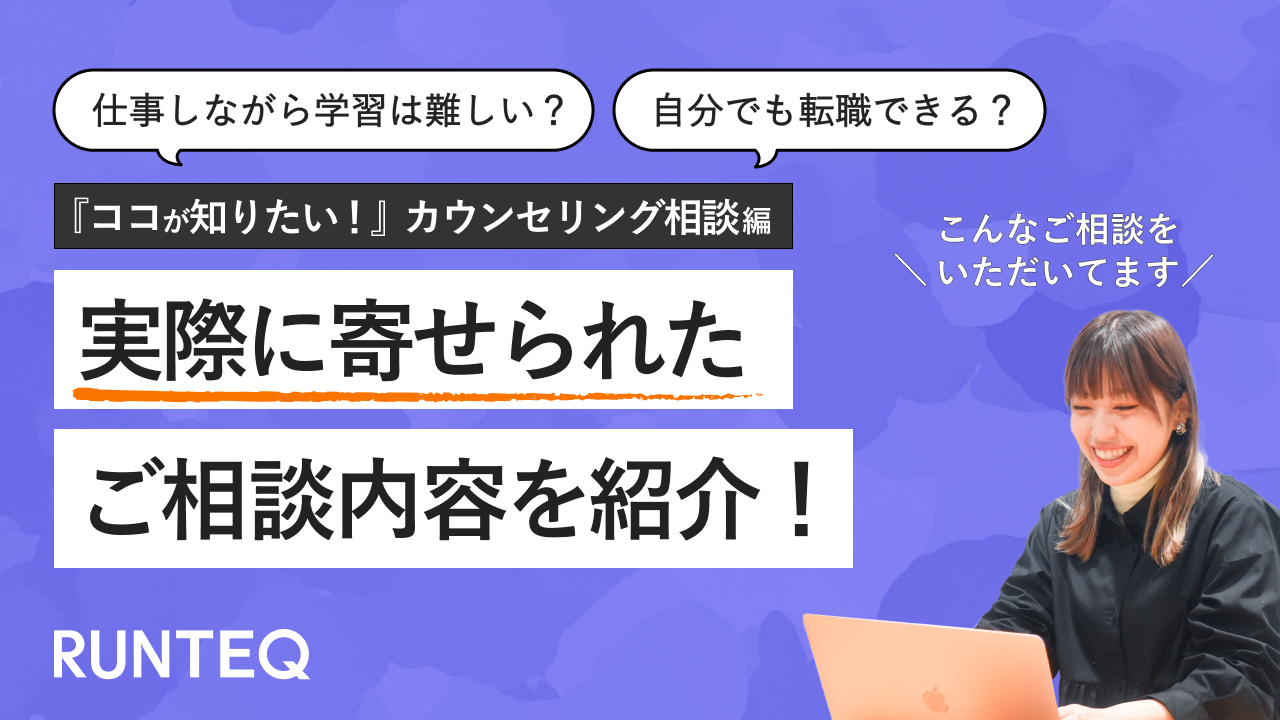 RUNTEQの無料カウンセリングでは、キャリアに迷っている方やスキルを身につけたいと考えている方から、日々たくさんのご相談が寄せられています。