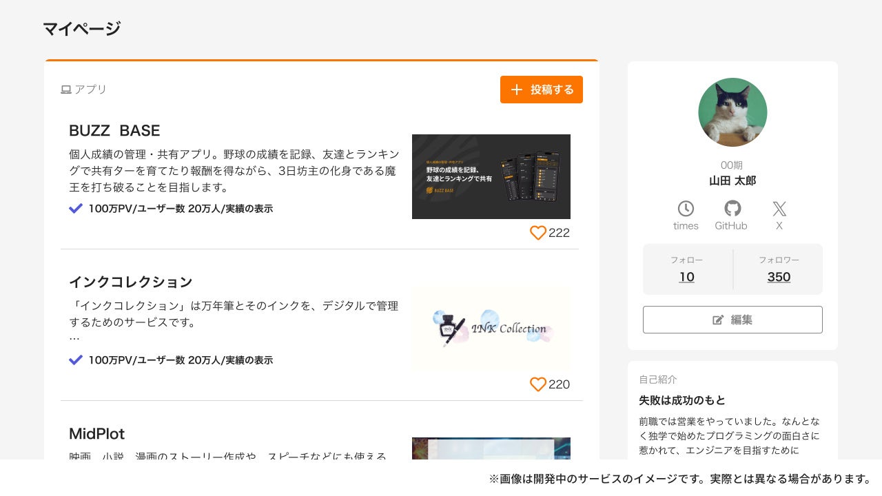 受講生1人1人が独自のページを持ち、自己紹介と合わせて記事やアプリ、イベントの登壇・参加履歴を追加出来ます。外部公開も可能なため、就活の際にもご活用いただけます。
