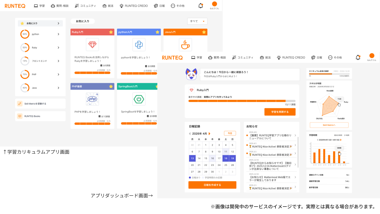 本サービスは、RUNTEQがこれまで個人向けに開発・提供してきたAI講師、AI自動コードレビュー、スキル評価サービス「Skill Metrix」、「AI日報」といったAI学習支援機能を統合し、法人の研修環境として体系化したものです。