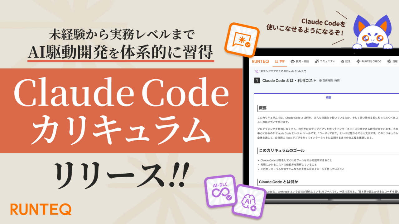 RUNTEQでは、今回のClaude Codeカリキュラムのリリースを含め、AIを活用した新しい開発スタイルを学べる環境を整えております。