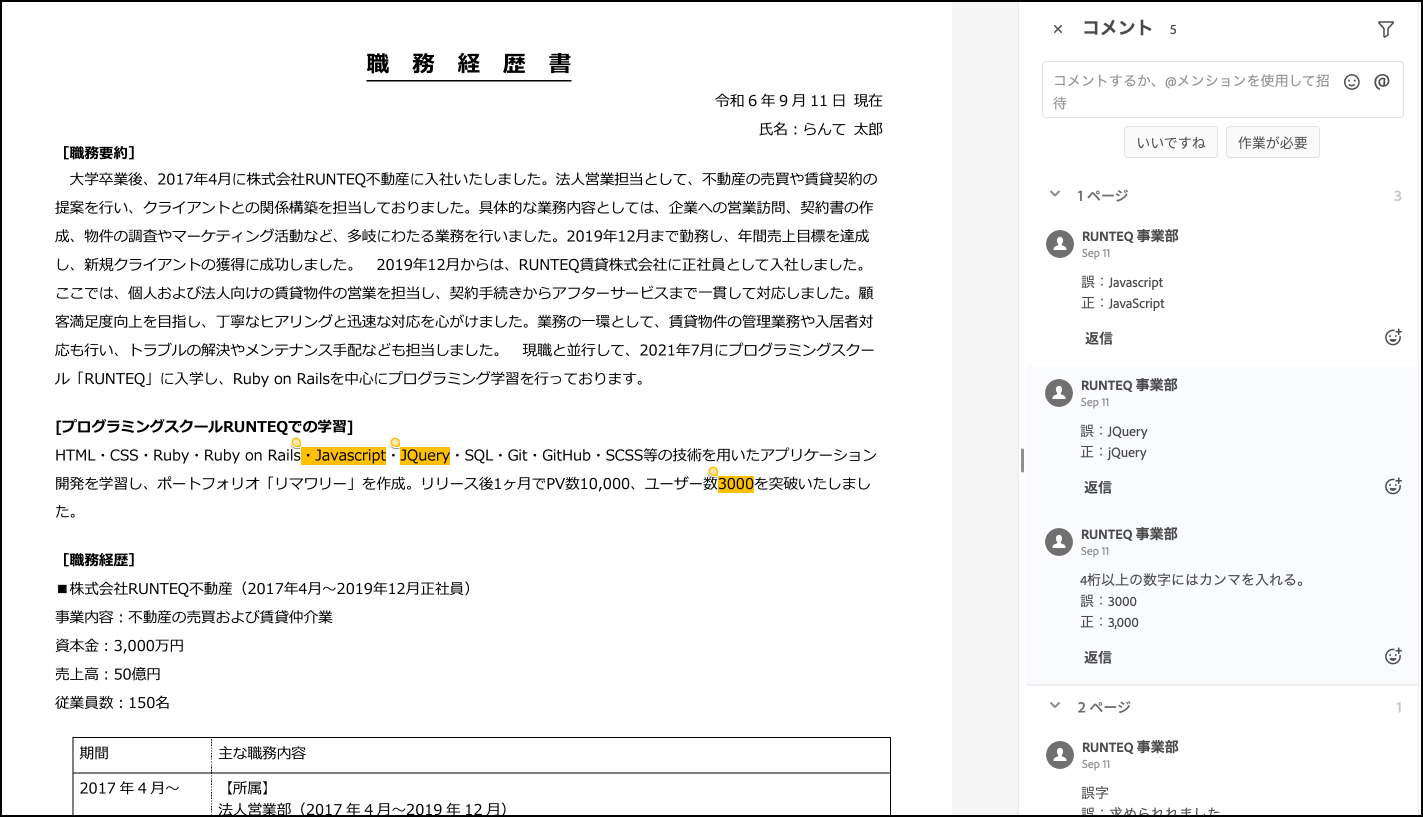 以下に、PDFに書き出した職務経歴書に対して、Acrobatオンラインツールを用いて指摘コメントを入れた例を示します。